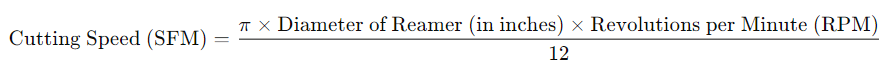 La velocità di taglio, o velocità superficiale, si riferisce alla velocità con cui il tagliente dell'alesatore si muove sul pezzo. Viene generalmente misurato in piedi di superficie al minuto (SFM) o metri al minuto (m/min). Per calcolare la velocità di taglio corretta per un alesatore, utilizzare la seguente formula: