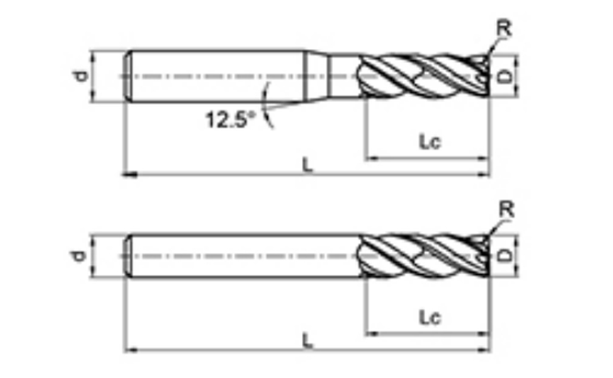 | No. | Diametro D | Angolo R R | lunghezza del flauto Lc | Lunghezza totale L | Diametro gambo d | Conteggio delle lame F |