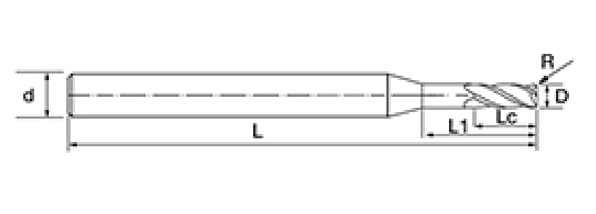 | No. | Diametro D | Angolo R R | lunghezza del flauto Lc | Lunghezza effettiva L1 | Lunghezza totale L | Diametro gambo d | Conteggio delle lame F |