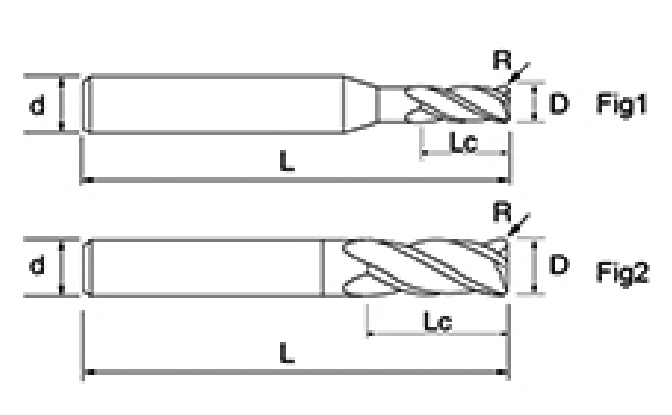 | No. | Diametro D | Angolo R R | lunghezza del flauto Lc | Lunghezza totale L | Diametro gambo d | Conteggio delle lame F |
