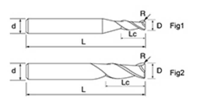 | No. | Diametro D | Angolo R R | lunghezza del flauto Lc | Lunghezza totale L | Diametro gambo d | Conteggio delle lame F |