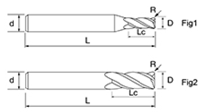 | No. | Diametro D | Angolo R R | lunghezza del flauto Lc | Lunghezza totale L | Diametro gambo d | Conteggio delle lame F |