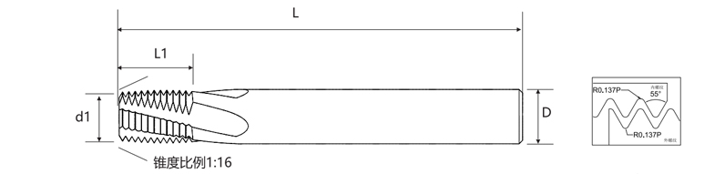 Questa fresa è adatta per una varietà di materiali, tra cui acciaio al carbonio, acciaio legato, acciaio inossidabile, ghisa, metalli non ferrosi e plastica. Disponibile in diverse specifiche che vanno da RC1/16 a 2", offre flessibilità per soddisfare diverse esigenze applicative. Il design dell'utensile consente configurazioni di parametri adattabili, tra cui diametro di taglio d1, lunghezza di taglio effettiva L1, diametro del gambo D e lunghezza complessiva L, ottimizzando l'efficienza di lavorazione e la qualità della filettatura.